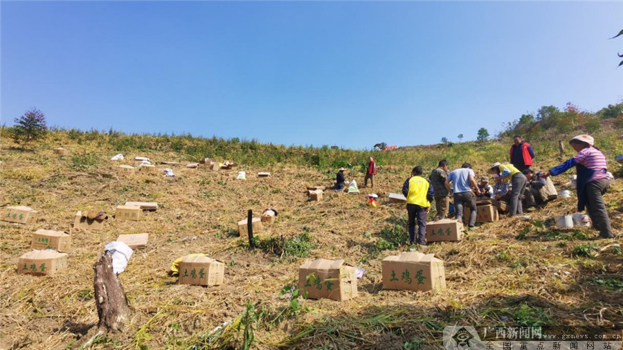黄晴春家的生姜大丰收,请其他农户帮忙收生姜。广西新闻网通讯员 蒙宝线 摄
