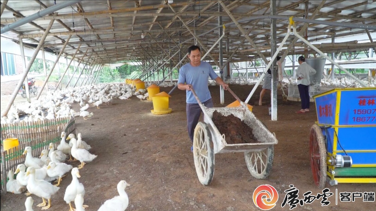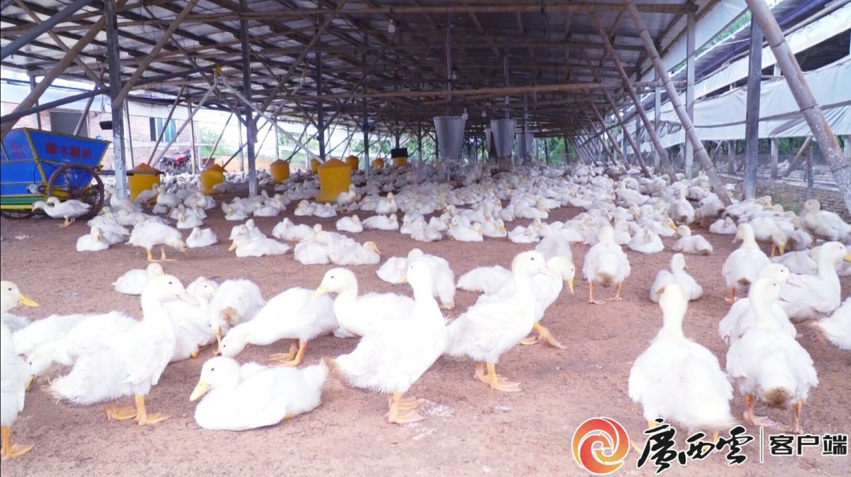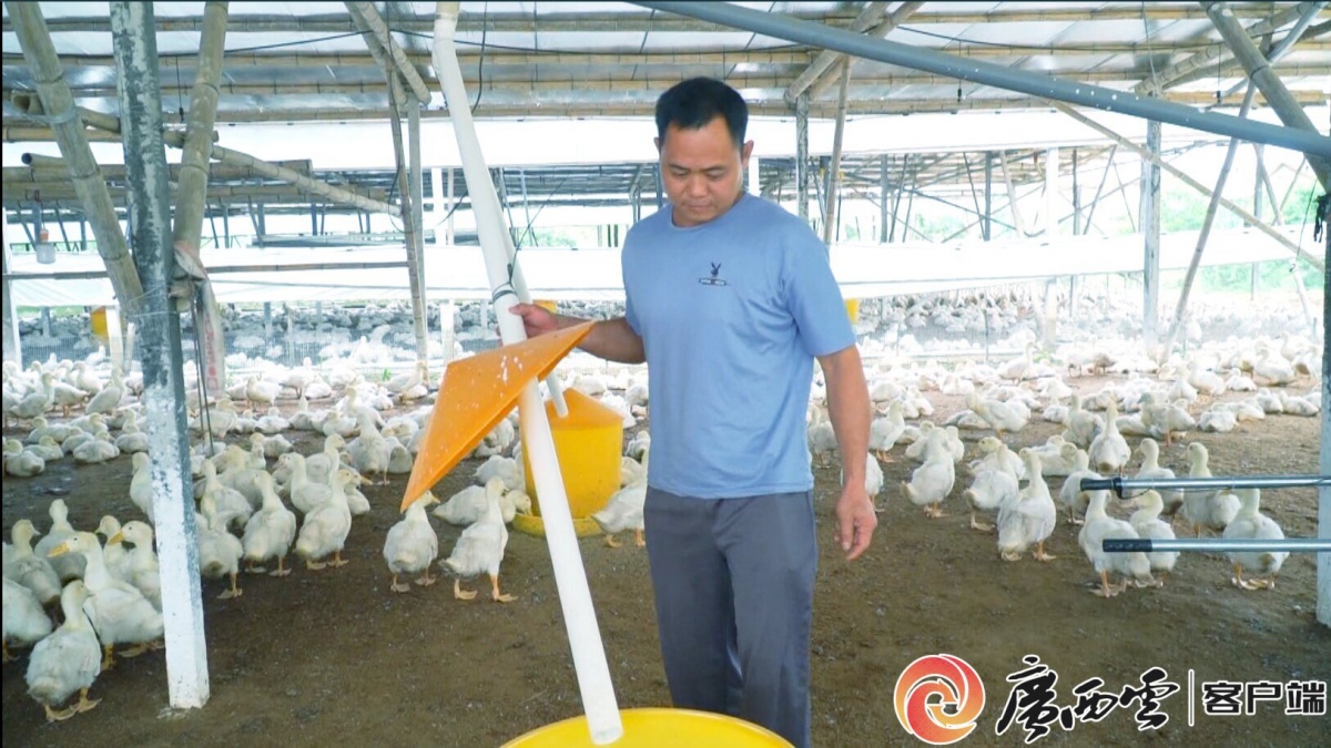 谢庆忠在放鸭饲料。通讯员 黎佳宁摄 “我的旱鸭养殖场自去年3月底建成投养,到现在已卖了7批鸭子共4万多羽,纯收入20万余元。”谢庆忠笑呵呵地说。 谢庆忠是大业镇泗龙村的脱贫户。2021年春,在广州务工的谢庆忠因家中母亲年老需要照顾,只好辞职回村,并经选举担任泗龙村党委委员等职务。经过详实的市场考察,他十分看好养鸭产业的发展前景,于是在2022年3月底筹资30多万元建成了一个面积约1800平方米的养鸭场,并以“公司+农户”的模式与广西实隆农牧集团有限公司签订合作养殖合同,由公司提供鸭苗、饲料、防疫药剂和管理技术指导、保价回收等服务,开始了每批饲养五六千羽鸭子的现代化、自动化、规模化的养鸭之路。
