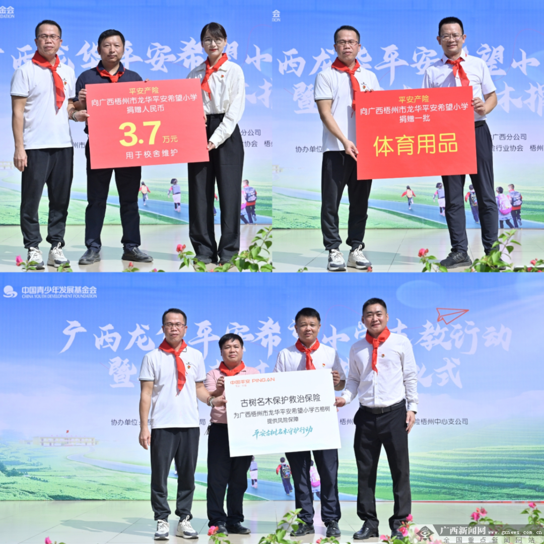 中国平安支教行动广西梧州站。 当天,平安产险广西分公司不仅给学校捐赠了3.7万元校舍维护基金及一批体育器材,还为校园内2株百年古榕捐赠了名木保护救治保险。这一刻,教育帮扶和生态守护种子与初心,藉由一堂课、一份物资、一份保障,默默而有力地植入了每个孩子的童年。